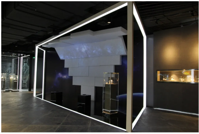 二層為鐘表文化體驗展廳,該展廳由五個部分組成:臨展區:預留投影面、展柜位等空間,滿足臨時主題展覽靈動可變的展示需求。多媒體互動區:通過聲光電一體化的多媒體系統介紹腕表的歷史與設計演變。手表材料與機芯展示區:通過空間沉浸式造景設計對手表機芯及手表不同結構材料進行展示。機械互動體驗區:通過空間造景和多媒體展示,打造虛實結合的體驗場景來介紹手表機械裝置和工藝。手作體驗區:手表拼裝體驗。
