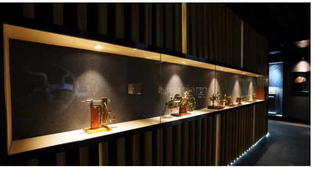 本工程飛亞達博物館博物館分為一層和二層兩個部分。一層主要以企業展廳為主,可用面積為700㎡左右。展示內容囊括了飛亞達企業軌跡及品牌產品推介兩部分,以飛亞達品牌時間線為綱,通過燈光和投影的配合,展現出“時間簡史”、“逢時而生”、“審時而動“、“應時而顯”、“馭時而創”五大主題區域,演繹出飛亞達的企業崛起之路。在這里,觀眾可以感受到飛亞達對時間的認知,對生活的主張,深刻體會到飛亞達品牌的內涵底蘊和工匠精神。