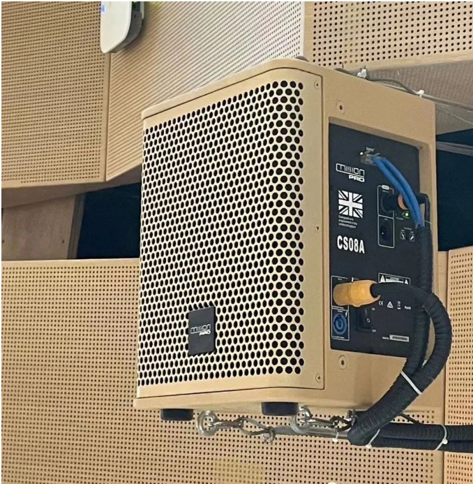 觀眾區域混響聲揚聲器,也采用固定安裝方式,采用18只CS08A全頻揚聲器和若干只ZTS12D Dante網絡有源低頻揚聲器作為觀眾廳頂部混響聲系統。