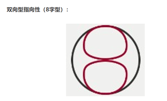 上圖顯示的是極性模式雙向型指向性(8字型),捕捉麥克風正面和背面的聲音,意味著對前后區域的聲音十分靈敏,而對兩側的聲音幾乎屏蔽。通常是鋁帶或大型振膜話筒所持有的“特技”。也是很多立體聲以及環繞立體聲錄音制式的必備技能。