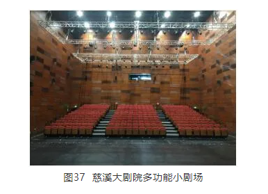 慈溪大劇院多功能小劇場(chǎng)由浙江大學(xué)聲學(xué)研究所負(fù)責(zé)建筑聲學(xué)設(shè)計(jì),場(chǎng)地頂面采用全開(kāi)放形式,排布了用于吊掛各種揚(yáng)聲器、燈光設(shè)備的桁架,墻面采用面塊板作縱橫經(jīng)緯的分割,內(nèi)襯吸聲棉,建聲條件較好,廳堂固有中頻(500 Hz)混響時(shí)間的最終測(cè)量結(jié)果為1 s。此項(xiàng)目的電子聲學(xué)環(huán)境可變系統(tǒng)也選用了E-Coustic系統(tǒng),因?yàn)檎麄€(gè)空間為全開(kāi)放式,所以,舞臺(tái)和觀眾席做了一體的聲學(xué)優(yōu)化設(shè)計(jì)。整套系統(tǒng)總共使用了4支傳聲器和54只揚(yáng)聲器,傳聲器選型與上述威海群藝館海洋劇場(chǎng)案例相同,分別吊裝于舞臺(tái)前方和中部的上空,以拾取舞臺(tái)任意位置的聲源。舞臺(tái)電子反聲罩系統(tǒng)共使用了23只揚(yáng)聲器,觀眾席則共安裝了31只揚(yáng)聲器,其中包括天花吊掛的6只超低揚(yáng)聲器,所有揚(yáng)聲器均采用明裝方式,如圖37所示。