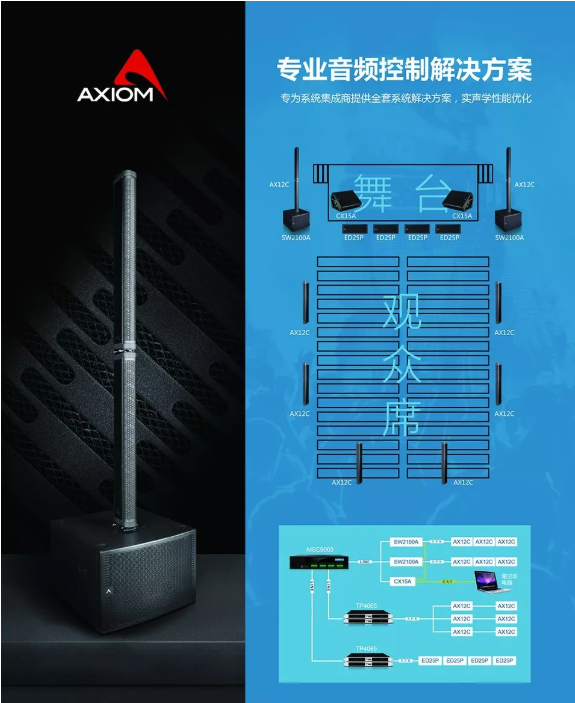 AX12C既達到了較高聲壓級的要求,又實現了小箱體、運輸方便快捷的目標,更重要的是呈現出來的聲音效果得到廣大客戶的認可,成功應用于流動演出、現場表演、樂隊演出、音樂節、劇場劇院、餐廳、酒吧等各大場所。