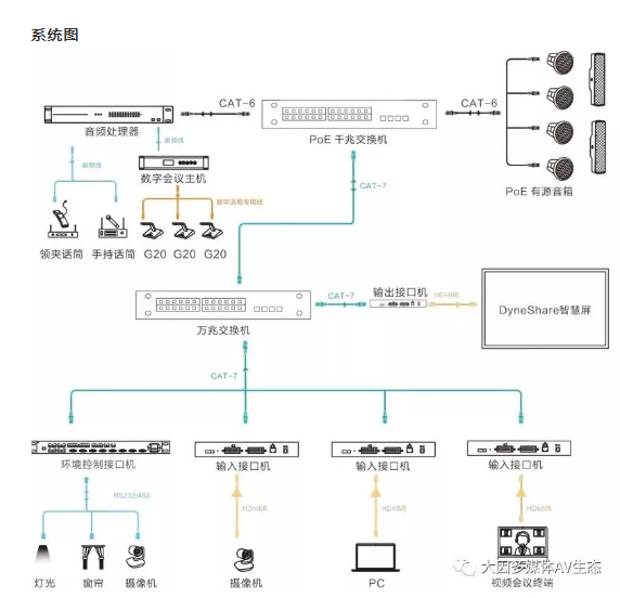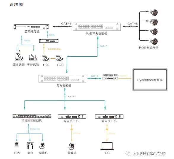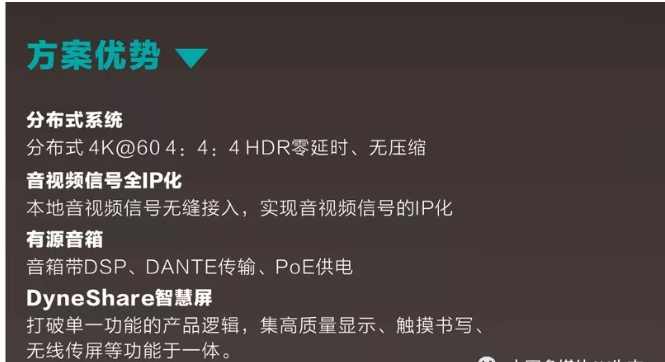 會(huì)議室是信息交互的平臺(tái),實(shí)現(xiàn)信息的傳遞主要是兩種方式,就是視和聽。視覺的內(nèi)容主要是圖像和文字資料,聽覺的內(nèi)容則是聲音。DANACOID通過DyneNet和DynePro系列打造音視頻全IP化系統(tǒng)。通過網(wǎng)線完成音視頻信號(hào)的傳輸、管理和控制,打造最佳的會(huì)議室視聽效果。