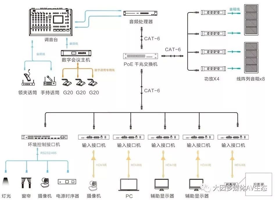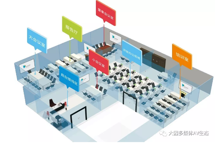 現代型會議室最基本的用途是討論會議、視頻會議、工作匯報等。因此需要滿足會議語言類的擴聲和視頻顯示的功能。同時如果作為分會場使用時需要滿足把主會場的音視頻信號實時的發送到會議室來。