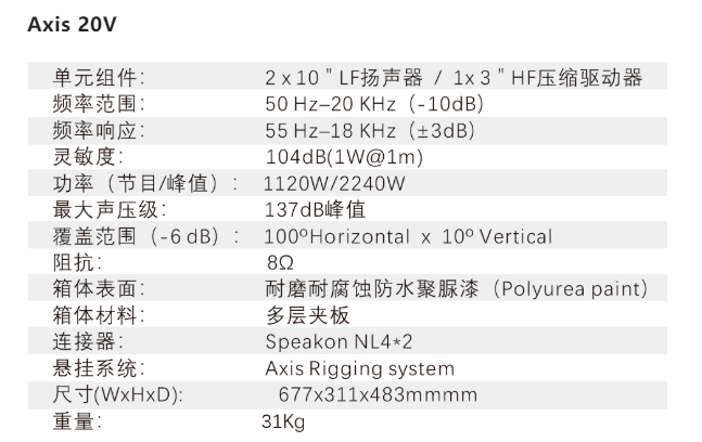 2x10"低音揚聲器(3"v.c.)提供擴展低頻再現,與安裝在專門設計的波導管上的一個高頻壓縮驅動器(3"v.c.)相互作用。這種對稱聲學設計產生了最精確的瞬態再現,使Axis20V能夠提供最細致和均勻的音頻性能