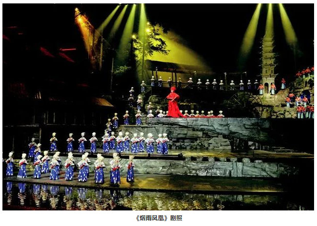 其實,這個方法之前也曾多次使用。不過這次的實踐讓筆者發(fā)現(xiàn),很多情況下聲音的獨特效果可以根據(jù)舞美場景,甚至利用舞美裝置的特性來實現(xiàn)。這一點以后也可以繼續(xù)跟音響師們研究探討,從中發(fā)現(xiàn)、挖掘并再現(xiàn)出契合戲劇創(chuàng)意的聲音效果。例如,國外有的錄音棚用老教堂或者工廠廠房改造,以得到想要的聲音效果,包括好萊塢的電影錄音。這具有無限拓展的可能性,因為每一種聲音在不同的空間都會是不同的,關(guān)鍵也在于音響師是否有主觀創(chuàng)新的想法,畢竟對于多數(shù)戲劇音響設(shè)計來說,音響師首先要保證的是戲劇對聲音的基本要求,然后才是個性化需求。另外,音響師對舞美空間的解讀也尤為重要,舉個例子,幾年前參加湖南鳳凰的《煙雨鳳凰》實景演出項目的舞美設(shè)計,景的縱深有50 m多,一側(cè)是用于造景的山,一側(cè)是吊腳樓,中間風(fēng)雨橋作為兩者的連接,遠處縱深就是利用實景的山和樹林。該劇的音響師就根據(jù)這樣一個悠遠的空間環(huán)境,制造從左到右的聲像差,形成由遠及近的聲音效果,的確讓觀眾感受到了空間距離上聲音傳遞效果,十分契合舞美所營造出的氛圍。